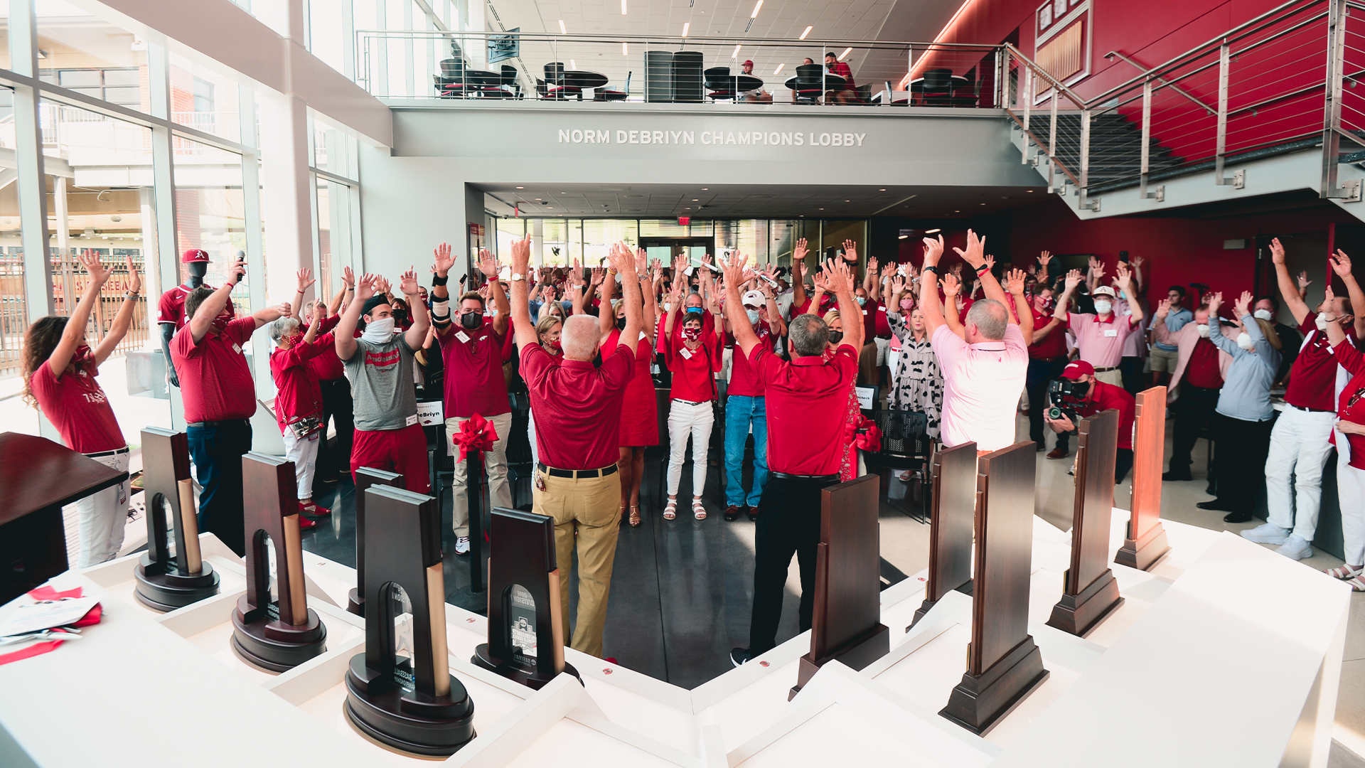 The one-of-a-kind facility sits in the right-field corner of Baum-Walker Stadium, connecting it with the west concourse and providing new premium seating areas for games. It also includes a tunnel to connect the facility with the first-base dugout. The Norm DeBriyn Champions Lobby features numerous historical displays and interactive content showcasing the history of Razorback baseball.
